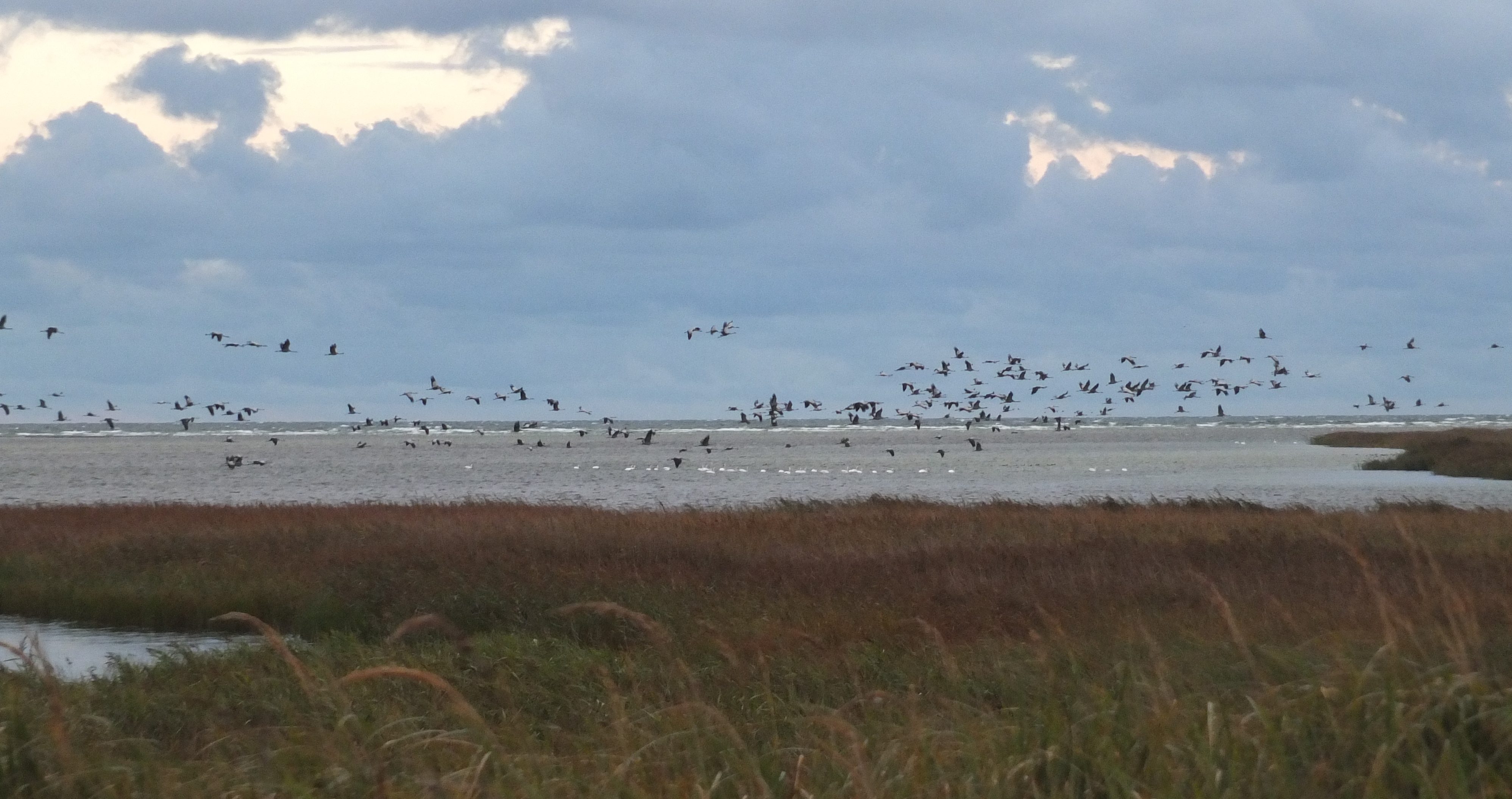 Blick auf den Großen Werder – wenn man Geduld mitbringt, taucht plötzlich Rot- und Schwarzwild auf, Graureiher, Seeadler, Kraniche… ein spannendes und lebendiges Habitat!